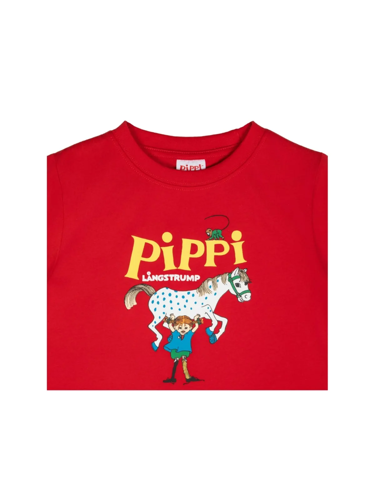 Laste punane lühikeste varrukatega T-särk Pipi Pikksuka kollektsioonist on täis seiklust ja rõõmu. Särgil on lõbus trükk Pipi ja tema hobuse Lille Gubbeniga, mille kõrval on tekst Pippi Långstrump.