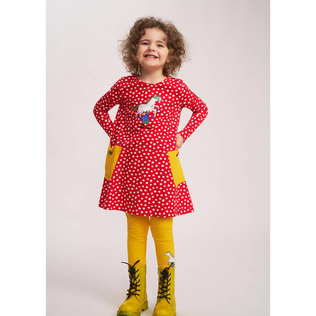 Laste pehme A-lõikeline Pipi Pikksuka kleit on pikkade varrukatega, ümara kaelusega ja laia alläärega. Kleiti kaunistavad kollased pealeõmmeldud taskud.