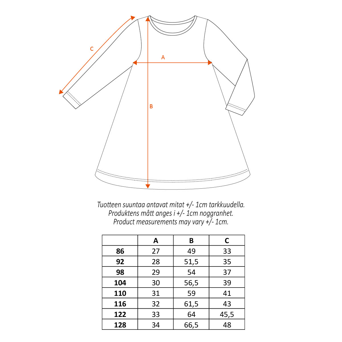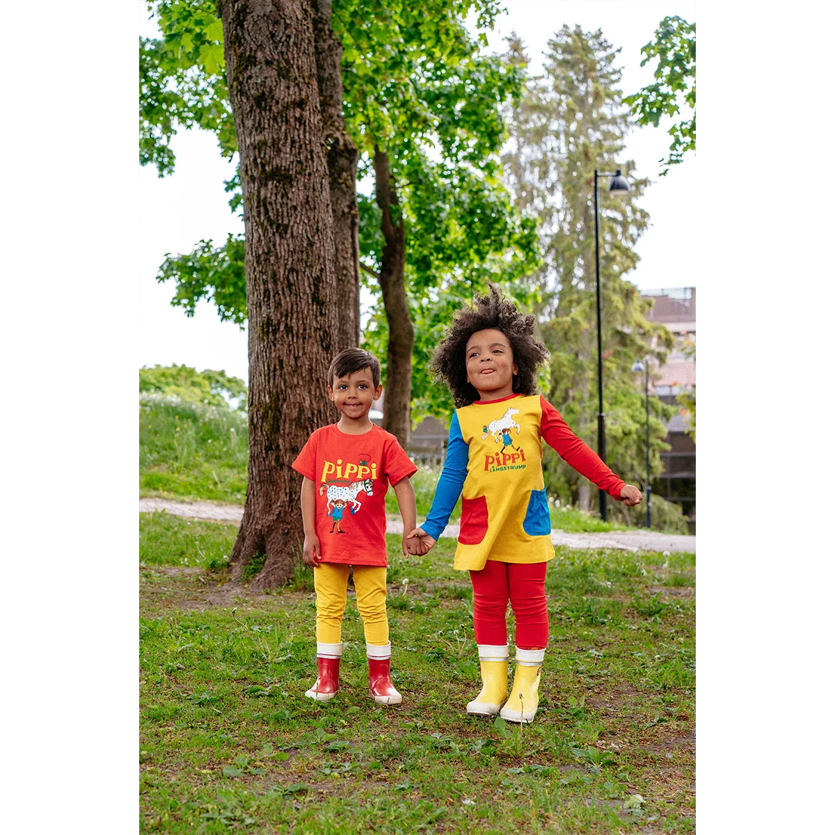 Kleit on A-lõikelise istuvusega ning pikkade varrukatega, millest üks on sinine ja teine punane, samal ajal kui kleidi põhiosa on kollane. Tõeliselt mänguline ja Pipilik välimus. Esikülge kaunistab pehme ja vastupidav kummitrükk ning kleidil on suured eri värvi pealeõmmeldud taskud. Valmistatud pehmest orgaanilisest puuvillasegusest trikotaažist, mis on mugav ja vastupidav igapäevaseks kandmiseks.