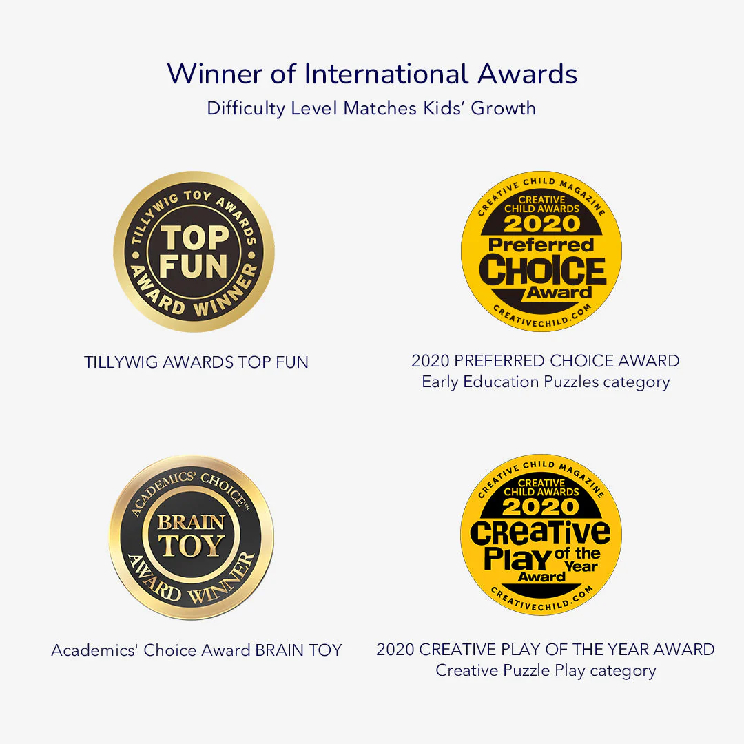 Komplekt sisaldab 6 erinevat puslet, mille raskusaste kasvab järk-järgult. Pusled koosnevad 2–6 tükist, mistõttu on need ideaalsed väikeste käte jaoks ja aitavad lastel samm-sammult puslede lahendamist õppida.